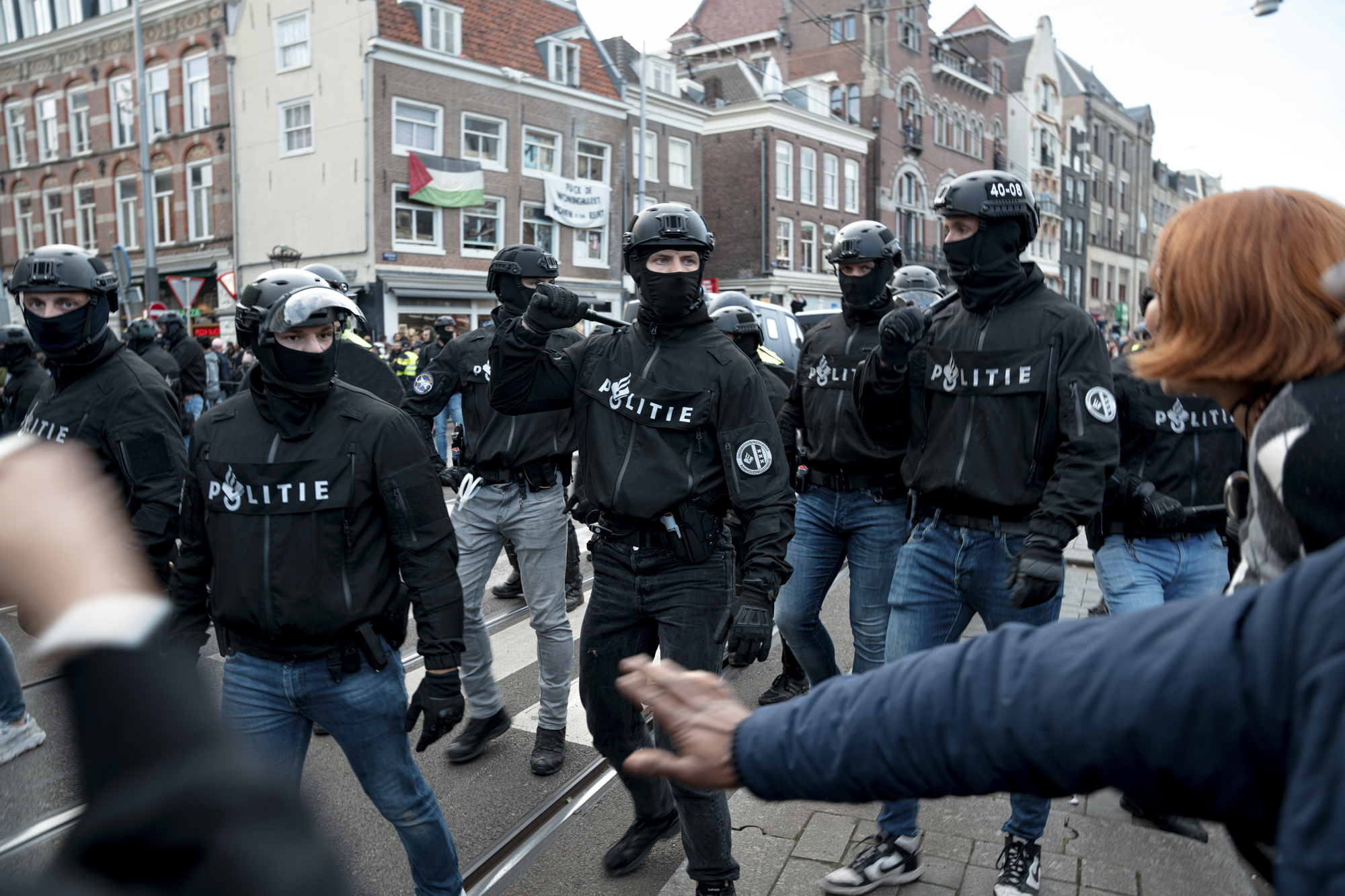 Amsterdam, Netherlands. 8th of may: Joining a wave of tension and protest sweeping across the U.S. and Europe, pro-Palestinian activists and students face the Dutch riot police at Rokin, Amsterdam, on Wednesday afternoon, after their two day encampenment at the university was evicted violently.